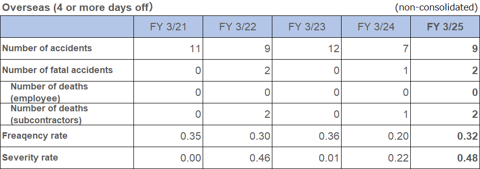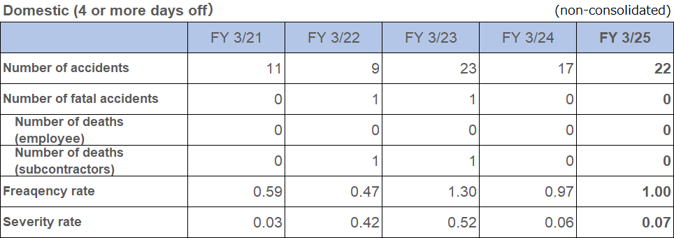 We have been implementing occupational accident prevention and quality management measures that prioritize safety and quality in Japan, and named it the Penta-Ocean Construction Standards. We spread these standards not only in Japan but also overseas and carry out occupational accident prevention activities in collaboration with subcontractors.