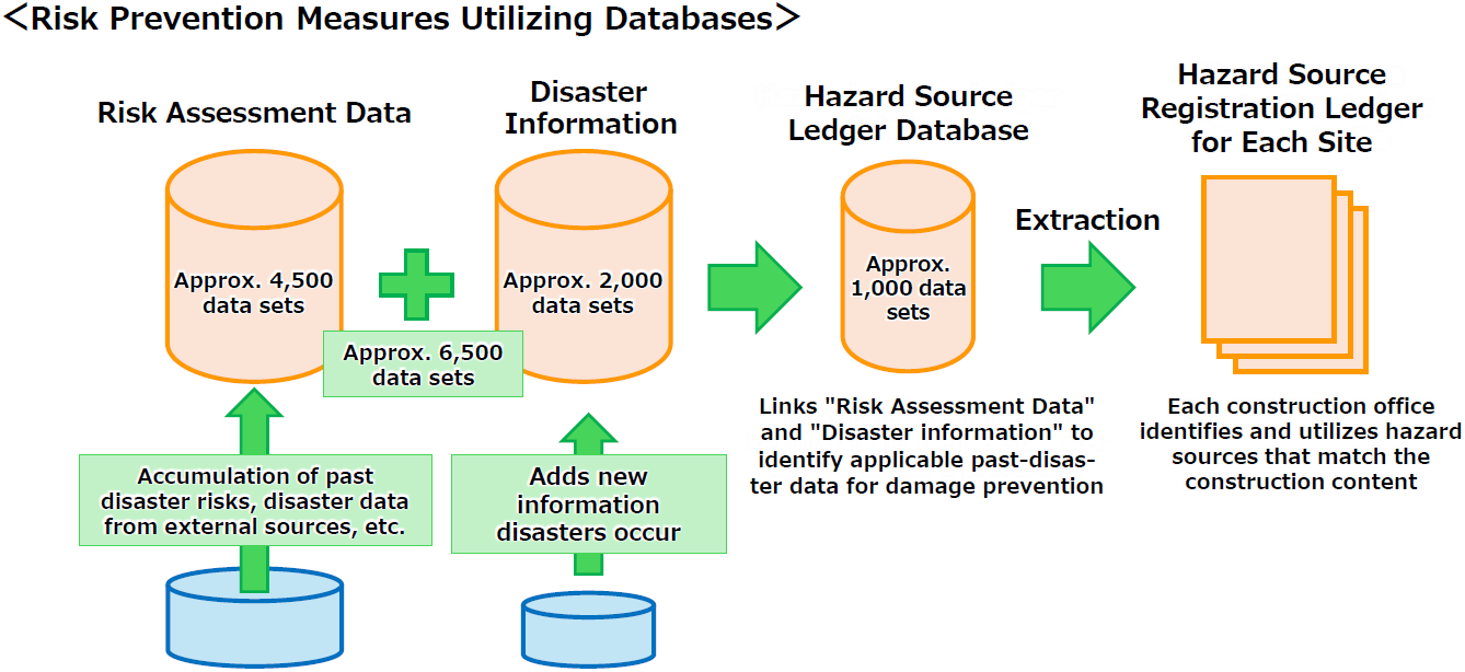 Based on approximately 6,500 data items created from risk assessment data and accident information, we have identified and registered about 1,000 high-risk hazards in a database, which is used for risk assessment. In construction offices, we use this database to identify risk factors, which are then shared with subcontracting companies, in each phase of work and during the project planning. The risk factors identified through above risk assessment are linked to disaster information, and situational photos and maps from actual disaster records are used to determine risk reduction measures. Thus, we are working together with our partner companies on disaster prevention measures to avoid the same disaster scenarios.