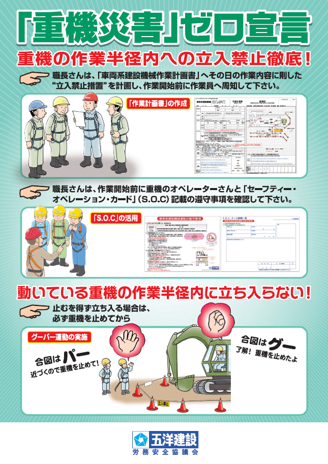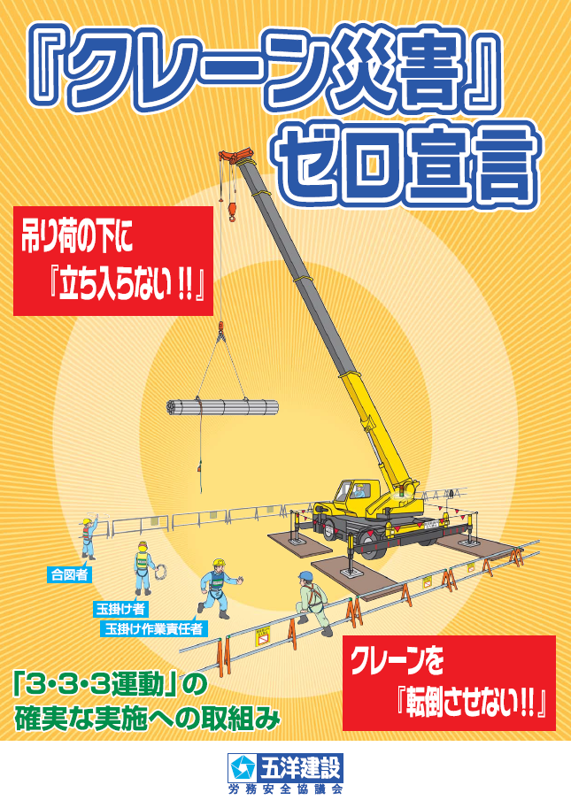 We have designated crash accidents, fall accidents and heavy machinery (crane) accidents as "Specific Accidents" and focus our efforts for preventing these accidents amongst all other accidents. Regarding the prevention of crash and fall accidents, we introduced a "Immediate 'Red Card' System for Workers Who Do Not Use Safety Belt*1," which suspends a worker from the construction site when he/she is found not using a fall prevention equipment (commonly, a safety belt) in a place where a safety belt is mandatory. As for the prevention of heavy machinery and crane accidents, we enforce the "Zero Heavy Machinery Accident Declaration" to reconfirm prohibition of entering a working radius of the equipment, and to assign guards to prevent any entry. Also, we enforce the "Zero Crane Accident Declaration," "Exercise 333*2."