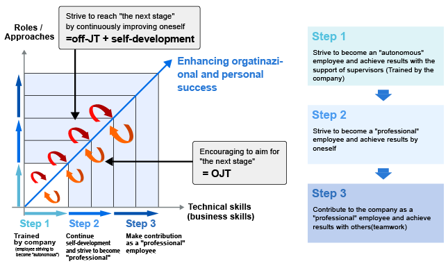 By clarifying each individual's "growth steps," visualizing the path to goal achievement, and providing detailed education, we promote a "co-educational culture" in which both trainer and trainee can grow together. By involving the entire workplace in the growth of new employees, we aim to promote growth in an environment where they feel supported.