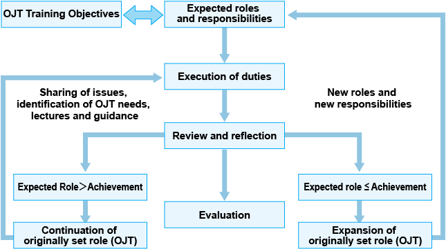At the beginning of each fiscal year, employees meet with their supervisors to set individual goals that are challenging yet attainable. In the mid-term, supervisors follow up with employees on his/her goal through daily work and regular interviews to encourage achievement of the goal as well as personal growth.