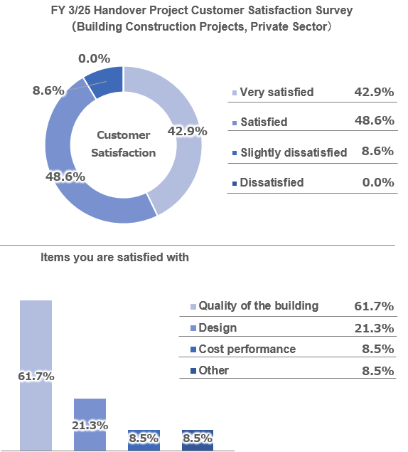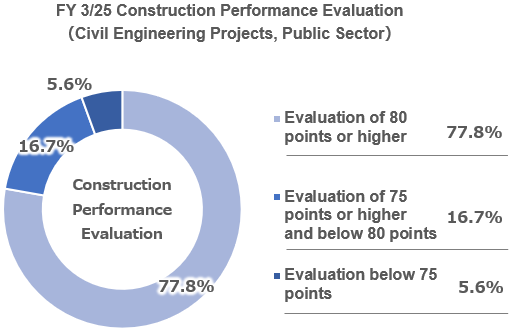 In the FY 3/25 survey, for public civil engineering works, approximately 95% of our work received very high client evaluations of 75 points or more. For private building construction, many customers expressed satisfaction with our constructed buildings, construction staff, and sales staff, rating them as "very satisfied" or "satisfied."