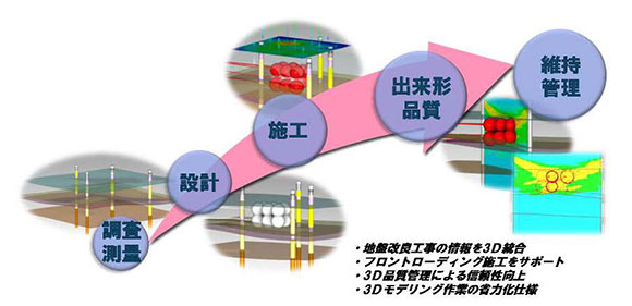 地盤改良工事は地中不可視領域が施工対象となるため、地中構造物との干渉リスクがあります。また、出来形や品質を直接確認することができません。これらの課題を解決するためには、地盤改良工事の「調査・測量〜設計〜施工〜出来形・品質管理〜維持管理」までの一連の工程の中で得られる情報を三次元的に統合、管理して“地中を見える化”できるCIMの活用が有効です(図-1)。Gi-CIMは既設構造物等のCIMモデルに地盤改良の施工管理情報を統合するツールで、主な特徴は以下のとおりです。