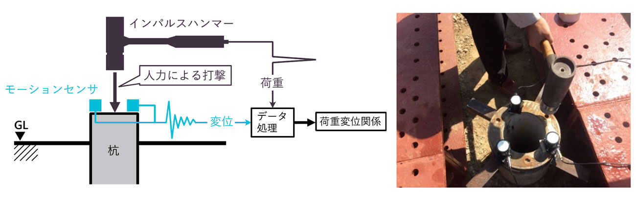 @大がかりな載荷装置を必要とせず、ローコストでスピーディーに杭の荷重変位関係が評価できます(水平載荷、鉛直載荷とも)。共同研究で試験を実施した条件(図2)では、従来法で500万円の費用と4週間の期間を要した試験を、2名の人員で30分以内、20万円の費用で完了しました注)。