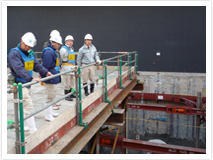 「北海道新幹線長万部駅高架橋」の工事において、副社長、安全品質環境本部長以下6人の中央安全衛生環境委員会によるパトロールを実施しました。各委員から、「作業区画や歩車道分離が「見える化」されていて良好である。外国人労働者も多いので、全作業員が現場のルールを目で理解できるような工夫をして災害防止に努めること」等の指導がありました。